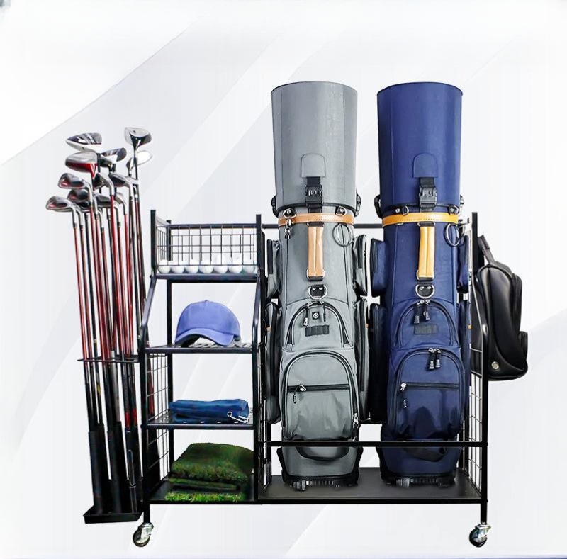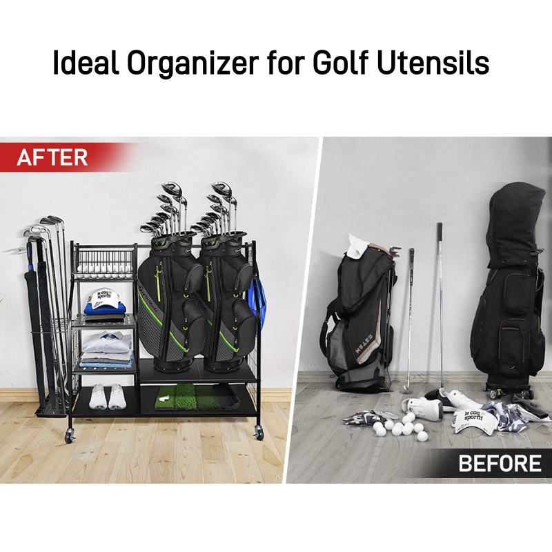 1. Extra large disign: Designed with 95.5cm*40.6cm*93.6cm size, this golf storage organizer fit 2 standard golf bag or 1 large size. With 3 extra medium shelves and 1 golf club storage stand. Organize and store all your golfing equipment in one spot.