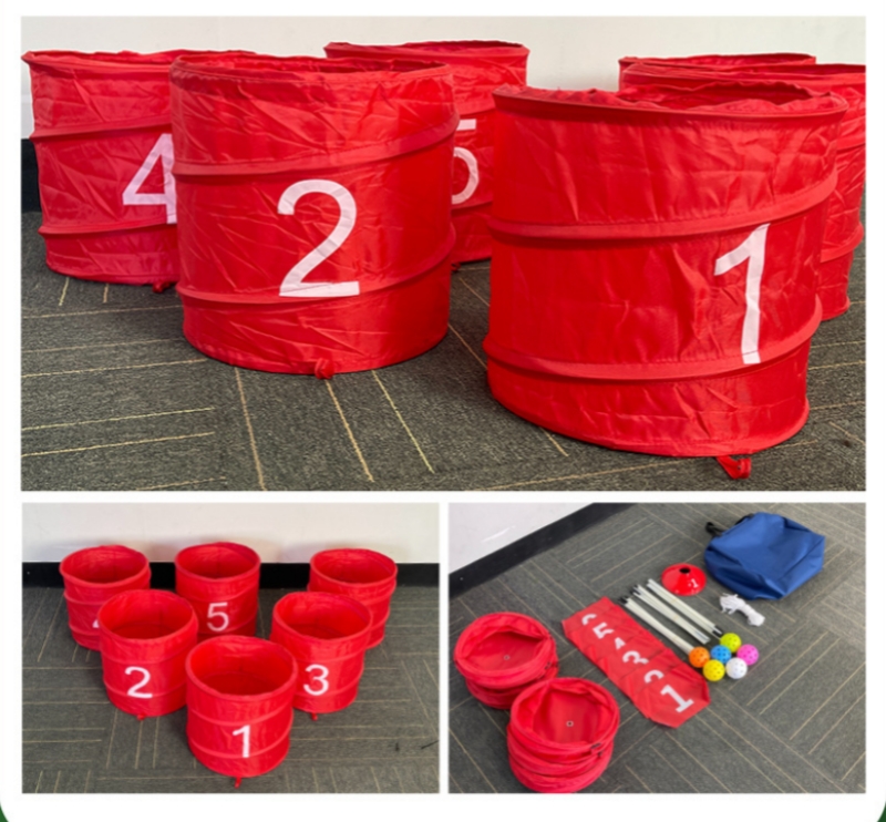 5. Sports and Outdoor Set: The golf game set includes 1 golf club, 6 buckets, 6 flags & poles, 6 pairs of obstacles, 6 pickle balls, and 1 carry bag.